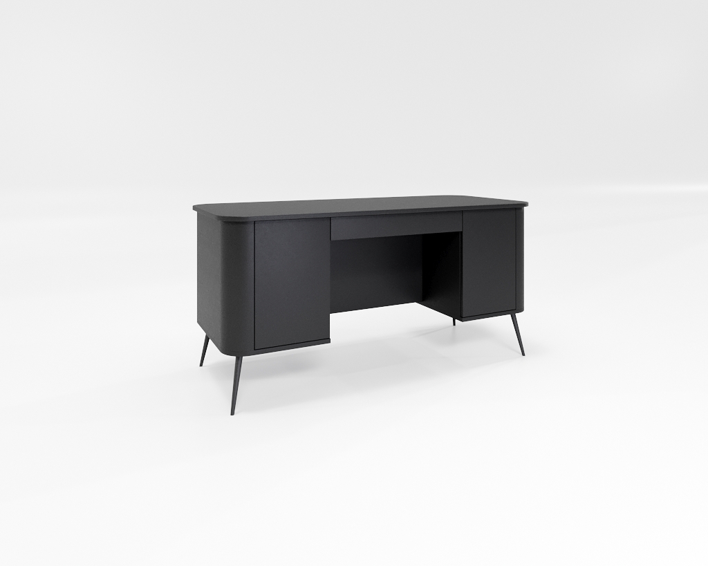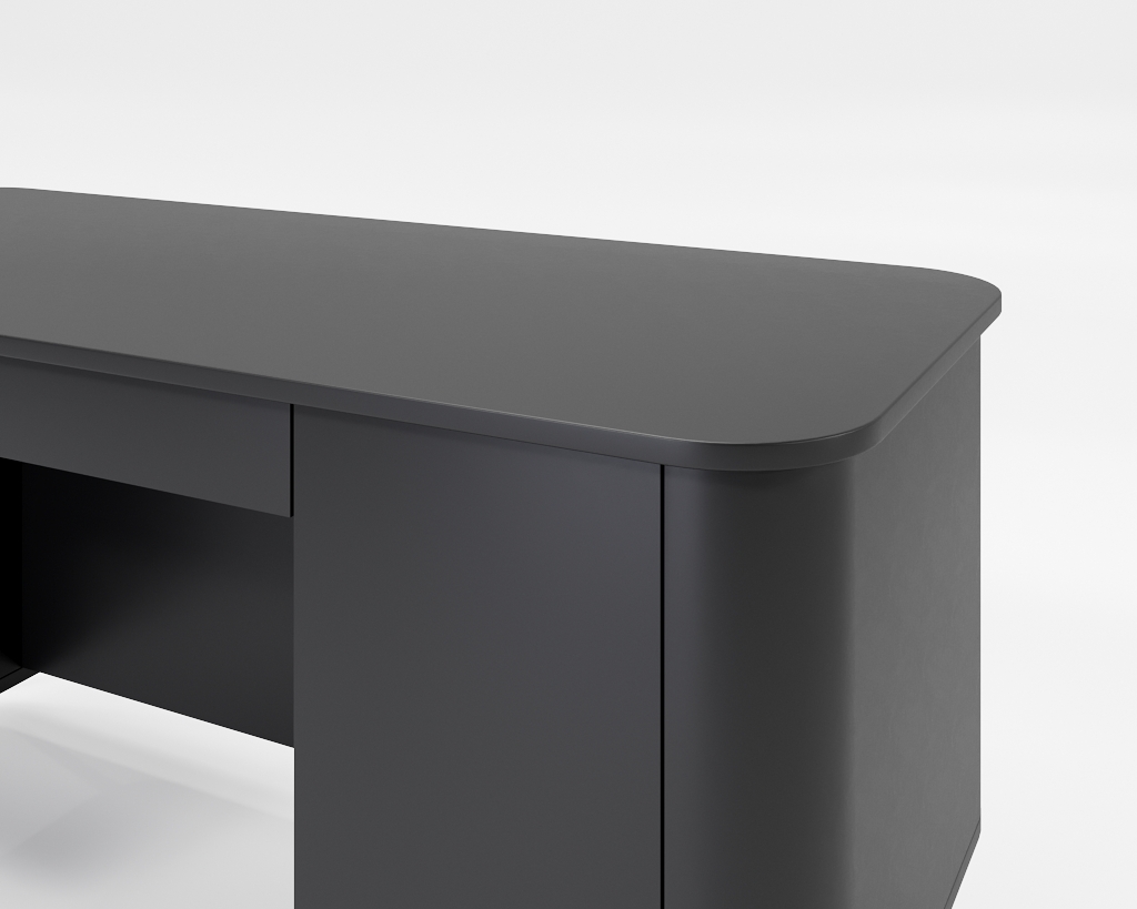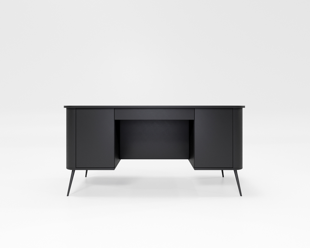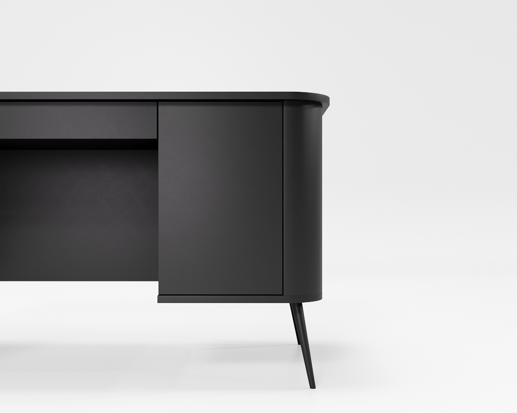 Biurko oferuje bezkompromisowy komfort użytkowania – systemy push, ciche domykanie szuflad i zawiasy puszkowe zapewniają trwałość i wygodę. Stalowe nogi lakierowane proszkowo w kolorze czarny mat dopełniają minimalistycznej, nowoczesnej estetyki.